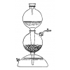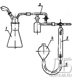 Аппарат для определения содержания растворенной воды в нефтяных маслах cостоит из колбы с ретортой 1, склянки Дрекселя с краном 2, бюретки с краном 3, сосуда уравнительного 4, соединенных между собой резиновыми трубками 5.