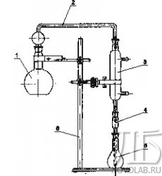 Состоит из колбы перегонной плоскодонной (500 мл) 1, насадки 2, холодильника 3, трубки 4 и колбы мерной приемной (250 мл) 5, закрепленных на штативе 6 зажимами. Детали прибора соединяются между собой с помощью конусных взаимозаменяемых шлифов по ГОСТ 8682-93 и закрепляются пружинками.
