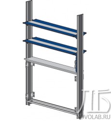 - две полки глубиной 350 мм из алюминиевого профиля на регулируемых кронштейнах со вставкой из материала Trovicel свободно перемещаются по всей высоте стойки (в стандартном исполнении нижняя полка устанавливается на высоте 350 мм, верхняя – на высоте 700 мм);