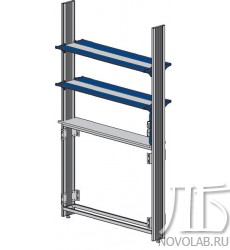- две полки глубиной 350 мм из алюминиевого профиля на регулируемых кронштейнах со вставкой из материала Trovicel свободно перемещаются по всей высоте стойки (в стандартном исполнении нижняя полка устанавливается на высоте 350 мм, верхняя – на высоте 700 мм);