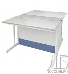 Органично дополняется нижними тумбами, которые навешиваются на заднюю соединительную панель стола при помощи крюков, а также двусторонними стеллажами, сливной раковиной, кранами для подвода различных газов и воды, которые устанавливаются в столешницу TRESPA в центре стола.