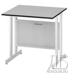 Пристенный стол органично дополняется нижними тумбами, которые навешиваются на заднюю соединительную панель стола при помощи крюков, а также стеллажом с односторонними полками для размещения реактивов и оборудования, сливной раковиной, кранами для подвода различных газов и воды, которые устанавливается во вспомогательную столешницу TRESPA.