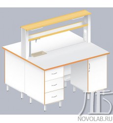 Стол оснащен надстольным стеллажом, в котором размещаются полки и электрика. В центре столешницы под стеллажом размещается кран для подвода холодной воды и сливная раковина из полипропилена (внутренние размеры 250х100 мм, глубина 140 мм).