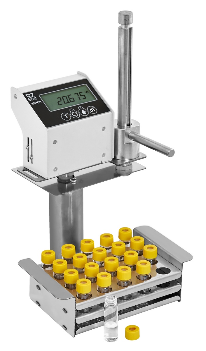 В нижней части электронного блока расположен подвижный датчик температуры и виала с испытуемой пробой, фиксирующаяся с помощью резьбового соединения.
