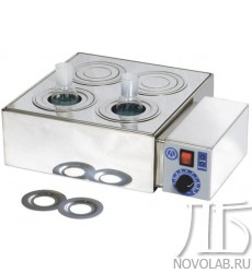 - cистема из 3-х концентрических колец из нержавеющей стали для размещения плоскодонных колб объемом до 1 л, стаканов, чашек для выпаривания и т.д. (максимальный диаметр отверстия 110 мм);